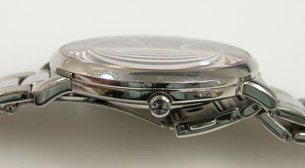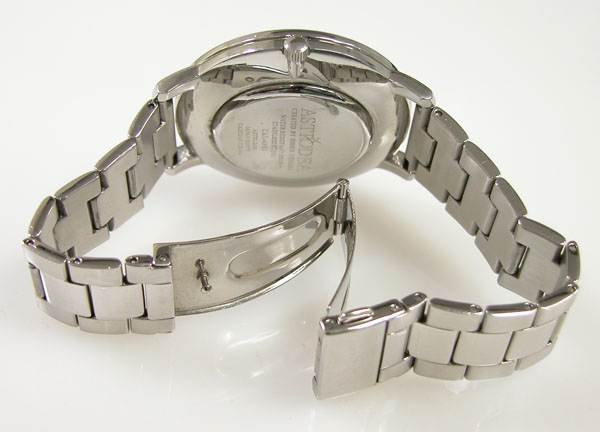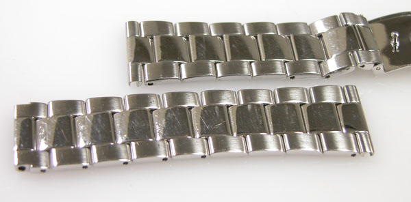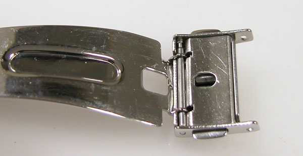 ステンレス無垢バンドに三つ折れプッシュバックル。