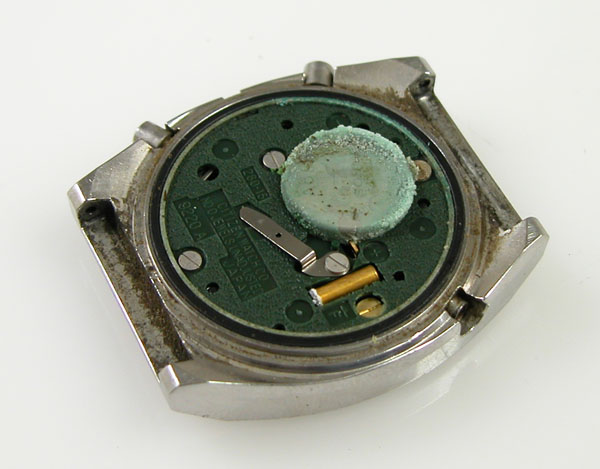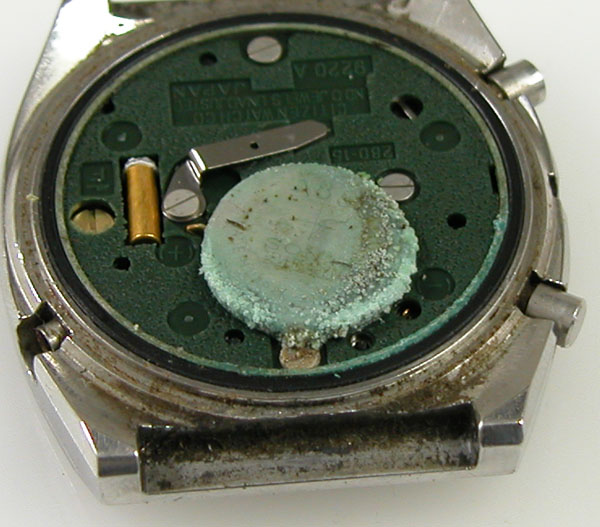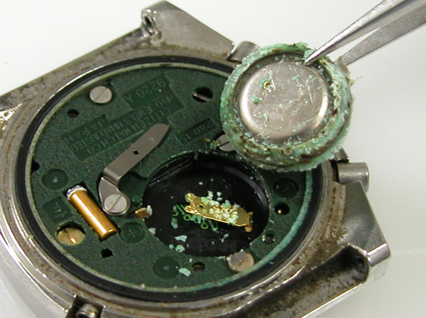 これがムーブメントですが・・・この電池の状態は。強烈な液漏れ。