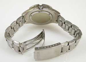 ステンレス板巻きバンドに三つ折れバックル。