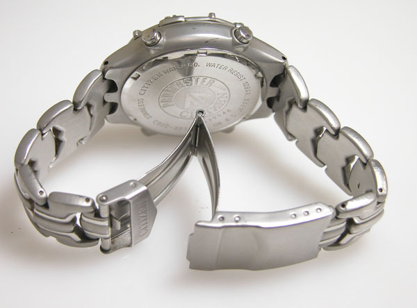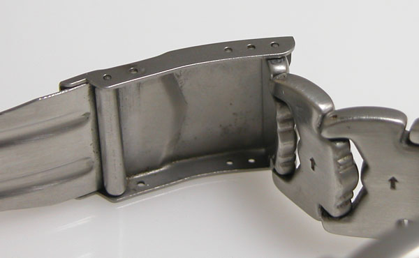 ステンレス無垢バンドに三つ折れダブルロック。