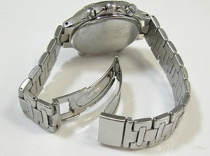 ステンレス板巻きバンドに三つ折れプッシュバックル。