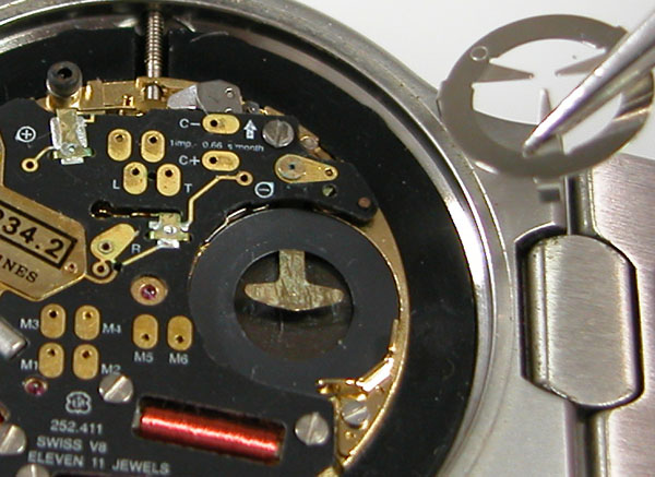 電池格納部をチェクしますが液漏れを拭いた跡があります。電池を入れて動作確認ですが不動でクォーツ・パルスも出ていないので回路交換か?