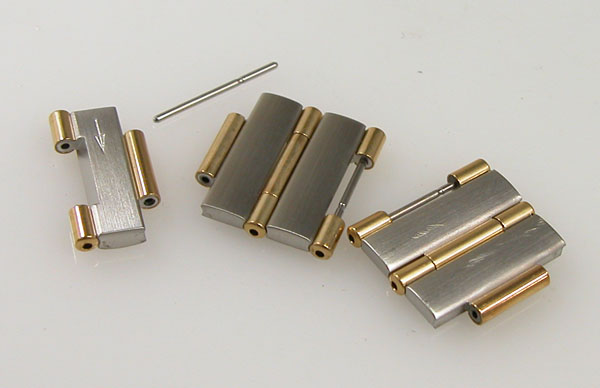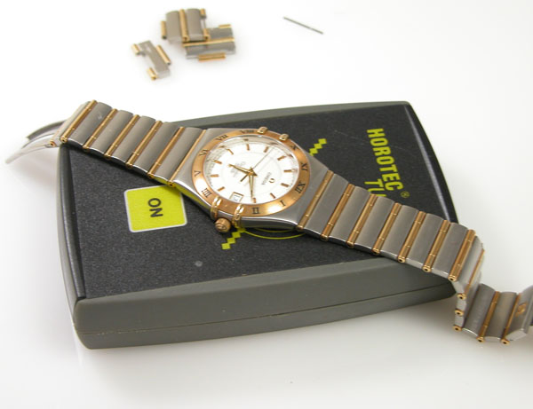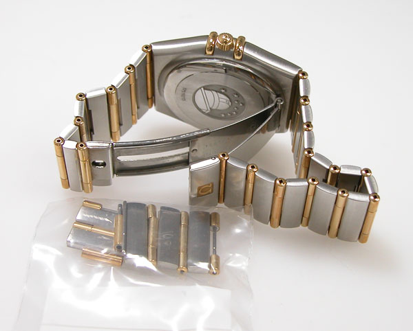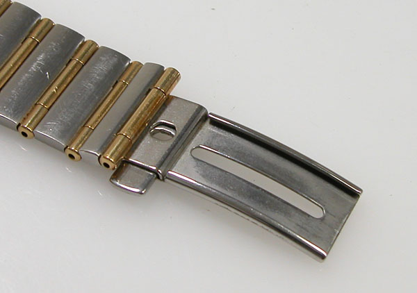 ステンレス無垢バンドに三つ折れプッシュバックル。余りコマ同梱でベルト調整もご依頼です。
