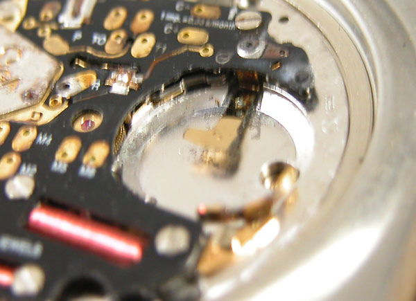 ムーブメントのロゴ・プレートも湿気でくすんでいる。