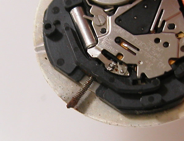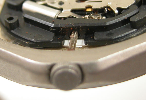 これがムーブメントで。この角度で見ても竜頭の歪みが分かります。