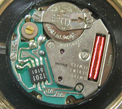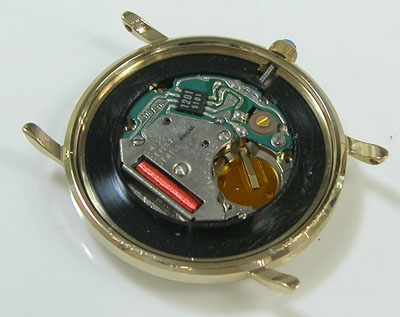 綺麗になったケースにムーブメントを戻して電池格納部をチェックします。電池を入れて動作確認ですが不動。注油調整でも微動だにせず。というかクォーツパルスが出て居ない。つまりは回路交換が必用ですがパーツが無いでしょう。