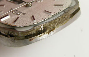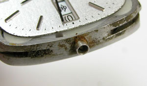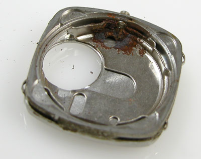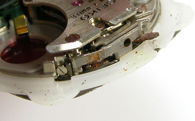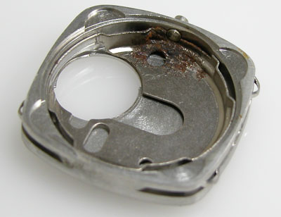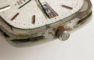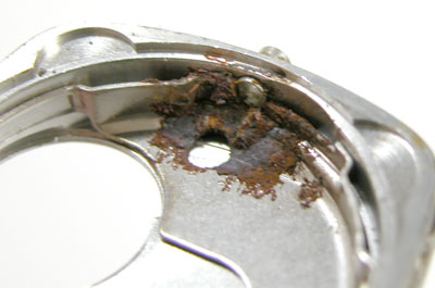 これはひどい。この状態から想像する状態は竜頭部分が水に浸かった状態であったでしょう。