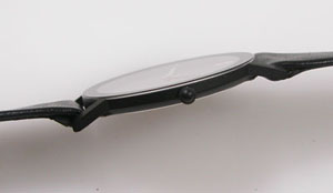 超薄型クォーツですがスマートでシンプル。遊び革の状態もチェックします。