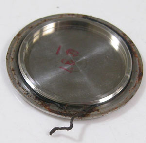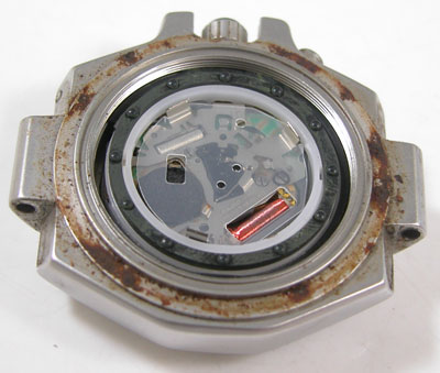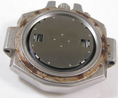 裏蓋を開けるとパッキンが溶けて役目を果たしていない。