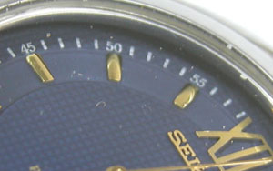 ガラスの内側にもホコリが多すぎですが、ムーブメント取り出しを行ったのでは作業で文字盤を動かしたのでホコリが入った感じですか。何でもこのインデックスは12時と6時は加工してオリジナルを作った為だとか。そう言われても何処をどう変えたのか私には分からない。凄い腕前です。私ら加工どころかインデックスは出来る限り触りたく無い箇所でもあります。