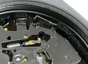 ムーブメントがキズだらけですね・・・レバーは曲がっているし動くのか?