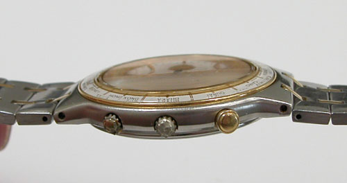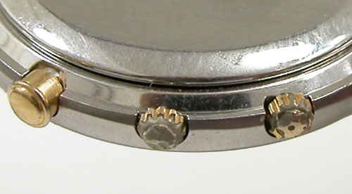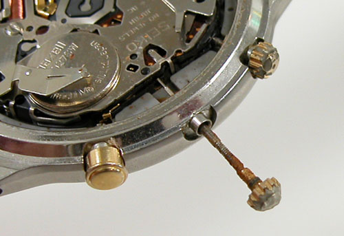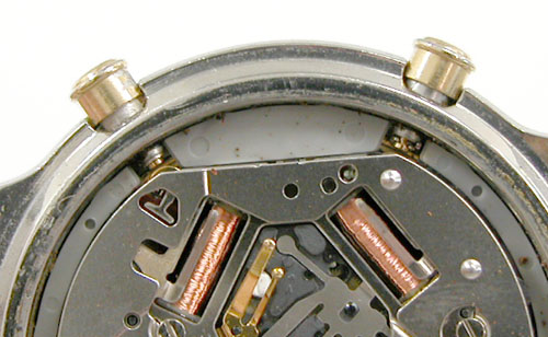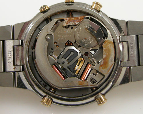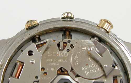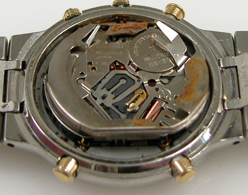 プッシュボタンや巻芯を伝って湿気がムーブ内部に浸透している雰囲気。