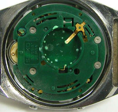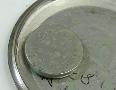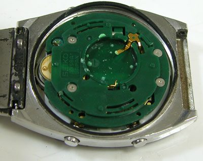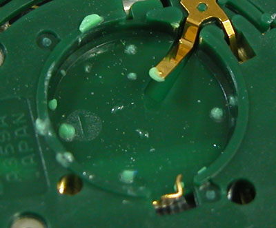裏蓋の裏側もチェックしますが電池が貼り付いているでは?しかも強烈な液漏れ。