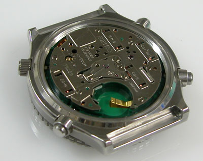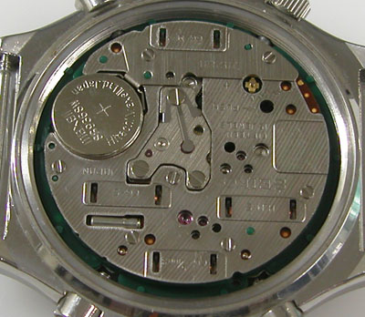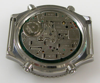 電池格納部をチェックします。電池を入れて動作確認で動いておりますがクロノグラフは「針がピクピクするのみ」で不動。時計だけの機能で使って頂くしかありません。