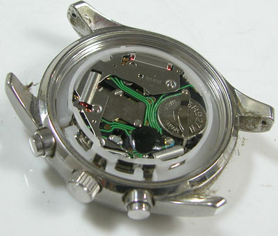 電池交換してみましたがクロノグラフのみ動いて不動。このムーブメントは分解修理やムーブメント交換も不可ですから返却となります。