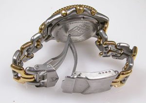 ステンレス無垢バンドに三つ折れダブルロック。