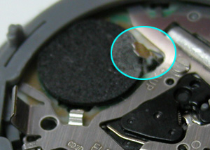 これが取り出した文字盤&ムーブメント本来酸化銀電池が入るスペースはスポンジが入れてあります。