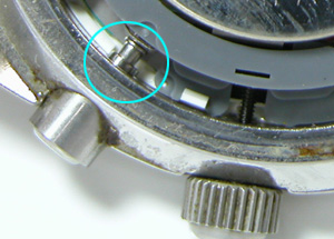 良く見るとクロノグラフでもないのに竜頭以外にボタンがあるんだから、ELライトが付いていて当然。これ受け付ける時にメールでは「リコーのアナログクォーツ電池交換」ですからまさかリチュウムを想像しませんでした。でも依頼される側が「ELライト点灯が付いていますからリチュウム電池です」なんて事は分かるはずがありませんね。