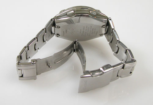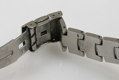 ステンレス無垢バンドに三つ折れプッシュバックル。