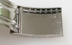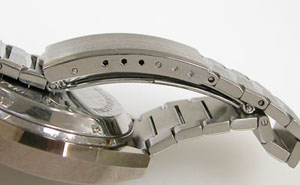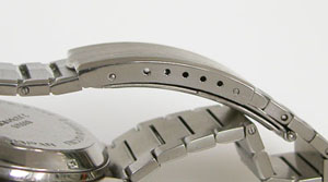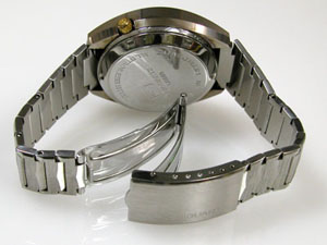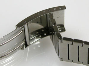 ステンレス無垢バンドに三つ折れバックル。
