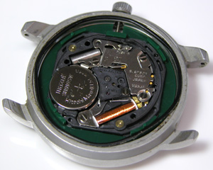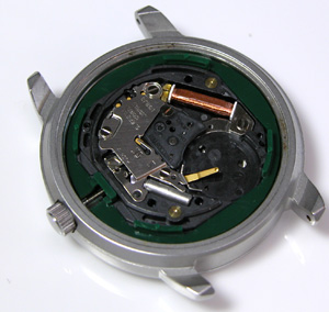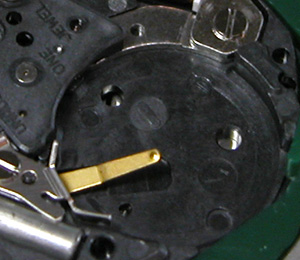見栄えだけでいけばドライバーで削れば、もっと綺麗になりますが、防水性能に影響が出てきますからこれ以上は削れない訳です。ムーブメントを戻して電池交換。