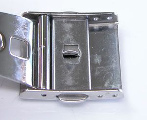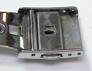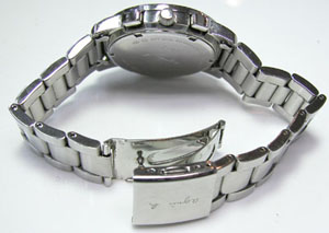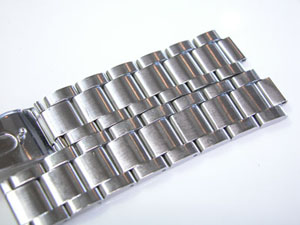 ステンレス無垢バンドに三つ折れプッシュバックル。