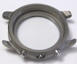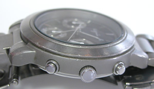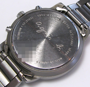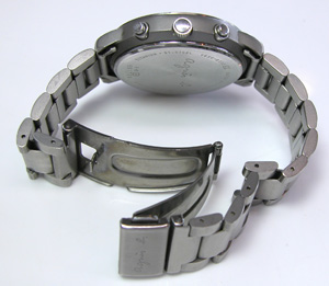 チタンバンドに三つ折れプッシュバックル。裏蓋は”はめ込みタイプ”。