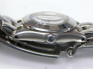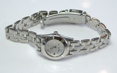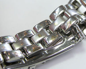 ステンレス無垢バンドに三つ折れプッシュバックル。