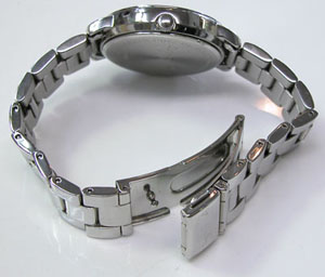 ステンレス無垢バンドに三つ折れプッシュバックル。