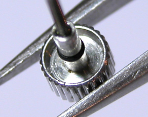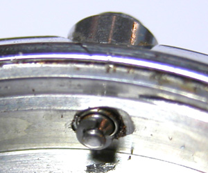 ところが、この場合はそれでも抜けません。この場合普通は”修理不可”で返却されます。何故かと言えば、その状態まで錆びると抜くのに手間が掛かります、でも修代金は割り増しでは頂けないからです。それにその状態では抜いて戻してもボタンが錆びてえぐれていますから、戻しても隙間が出来て防水性は維持出来ません。