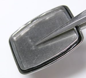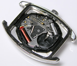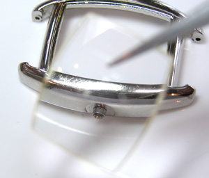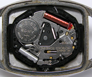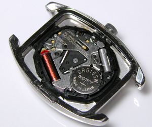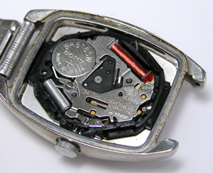 今回は割れていませんから接着するのみ。(1.000円追加です)ムーブメントを戻して、電池格納部をチェックします。