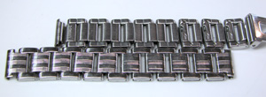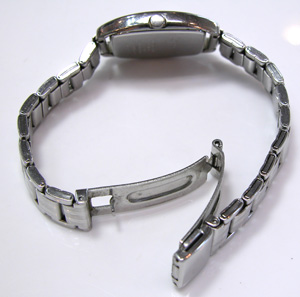 ステンレス板巻バンドに三つ折れプッシュバックル。バックルも板バネですね。