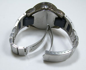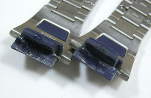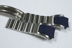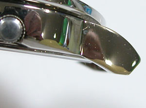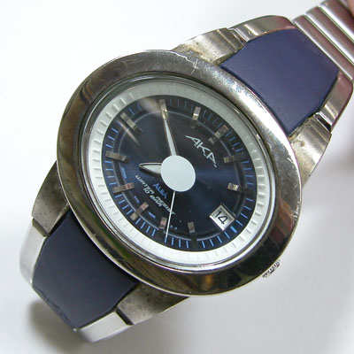ステンレス板巻きバンドに三つ折れバックル。ケースの腐食・・ではなく酸化というかこの黒ずみは取れるのか?金属クロスで磨いたくらいでは変化は無し。かといってAKAのメッキはバフ掛けに耐えるか。そろっといくしかありません。