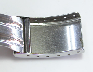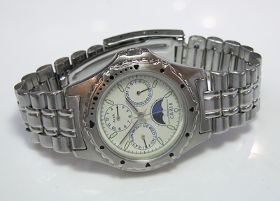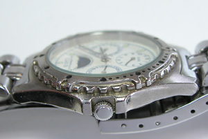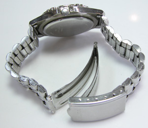 回転ベゼルに、ねじ込み竜頭はダイバー仕様。ベルトはステンレス板巻きバンド。