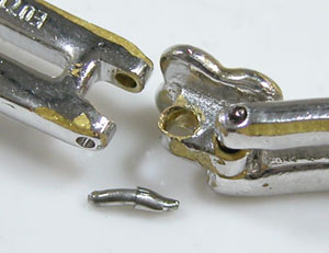 Cリングピンですがパイプもピンも曲がって使い物にならない。おまけにCリングパイプが通る穴が摩耗して大きくなっております。これではパイプが固定出来ない。この症状は修理は不可、方法はコマの新品交換しかありません。でもそれもメーカー在庫は無し。