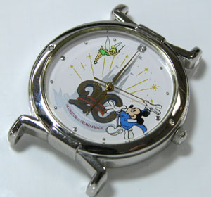 ディズニー20周年ウォッチ電池交換メンテナンスです。ディズニーと言えばセイコーの腕時計ですか。クリスタルフラットガラス、ケースには若干のくすみ。