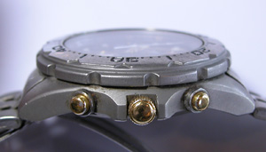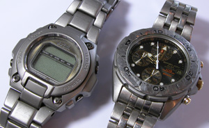 ダイバータイプの腕時計。ベルトは板巻き三つ折れバンド。チタンです。