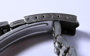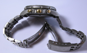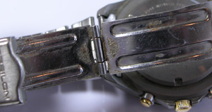 おや?このバックルのバネ棒位置はおかしい、後で修整しましょう。板バネの汚れもありますからベルトごと洗浄します。