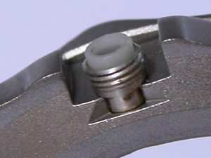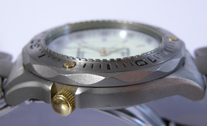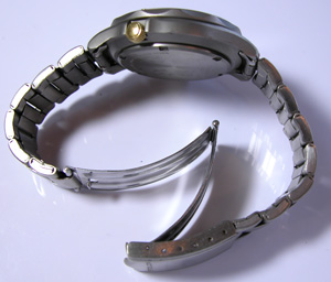 チタン板巻きバンド、無垢ではない板バネ三つ折れバックル。裏蓋はスクリューバック。