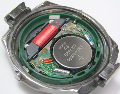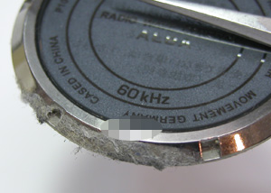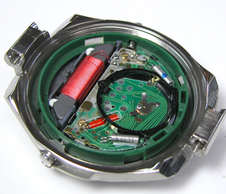 このケースの形状から仕方が無いですね・・。電波時計ですから大きなコイル(アンテナ)が見えます。