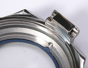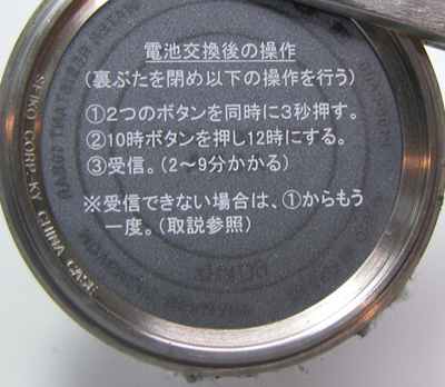 裏蓋はスクリューバックで電波を通しやすい様にガラスがはめ込んであります。こちら裏蓋記載。