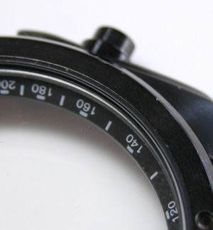 クロノグラフはこの目盛がありますからケースの洗浄が出来ない。洗浄すればこの目盛部分に洗剤の跡が残る場合があります。それを承諾なら洗浄も出来ますが。こちら正常側プッシュボタン。