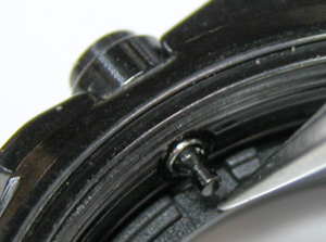 そこで外してこうセットしますが・・プッシュボタンが当たってします。またこのブラックの特殊塗装が滑る。ぎりぎりでセットして回しますが、裏蓋が堅すぎてケースがバイスからずれてしまいます。
