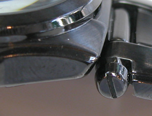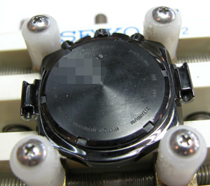 衝撃でオープナーがずれて裏蓋にキズが付きます。(;^_^A。これではいかんと、向きを変えて再チャレンジ。これも下手をすればラグ部が折れますからヒヤヒヤ。