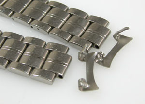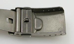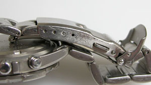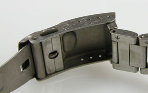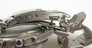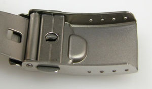 チタン無垢バンドに三つ折れプッシュバックルはダブルロック。