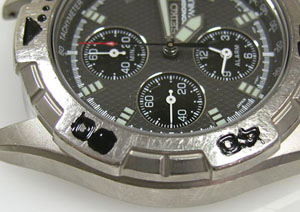 ケースの洗浄は終わってツヤが出ましたね。見事に回転ベゼルの数字の塗装が抜け落ちましたので、跡で墨入れです。