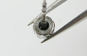 綿棒で拭き取ります。これが雑貨系統の時計なら溝が浅く、拭き取りで塗った塗装がおちてしまいますがセイコー製品なら大丈夫。