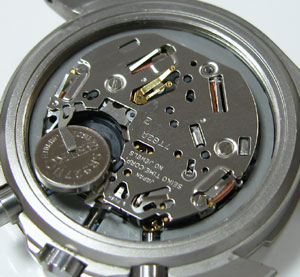 先ずはベルトを外してラグ部チェック。これがムーブメント、セイコーのクロノグラフには多いムーブメント。電池交換は簡単そうですが電池の取り出しにコツが要りますね。