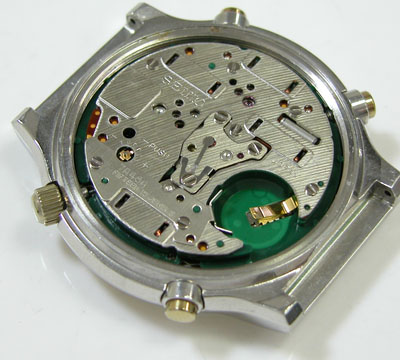 綺麗になったケースにムーブメントを戻して電池格納部をチェックします。ただ長年放置独特のくすみ具合ですから動くのか。