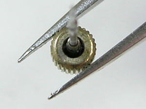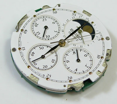 0位置合わせを行って・・・0位置合わせが出来るということはクロノグラフは動きます。でも肝心の秒針が動かない。注油調整でピクピクはし出しましたが進まない。注油調整でも動かないのはクォーツのローター回りの摩耗粉が不着している可能性大。